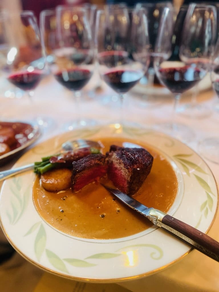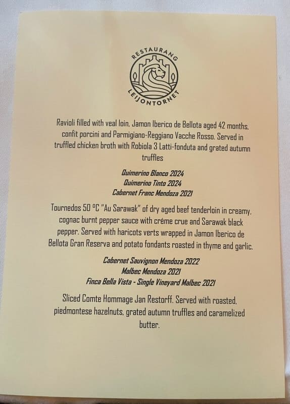 Till de tre avslutande röda vinerna, Malbec Mendoza 2021 och Finca Bella Vista Single Vineyard Malbec 2021, presenterades en perfekt stekt tournedos. Denna exklusiva köttbit låg inbjudande på en spegel av den mustigaste pepparsås, makalöst gott. Restaurang Leijontornet har uppenbarligen förstått den kritiska betydelsen av rikligt med sås! Som tillbehör serverades en krämig potatisfondant och friska haricot verts.
