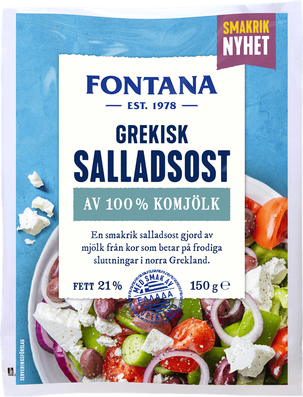 Fontana Grekisk Salladsost 150 g är gjord av pastöriserad grekisk komjölk och lagrad i saltlake. Rekommenderat pris är 16.90 SEK. Produkterna finns på Hemköp, Willys Coop och Citygross från vecka 7.