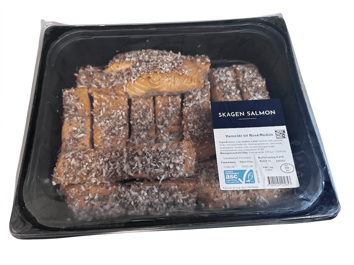 Därefter har vi den oemotståndliga varmrökta laxen, naturell. Denna produkt är ett lysande exempel på hur man låter råvarans egen excellens stå i centrum. Med en perfekt konsistens som är både saftig och fast, och en smak som är djupt aromatisk utan att vara överväldigande, får den verkligen briljera. Den varsamma varmrökningen tillför en sofistikerad, subtil ton som inte maskerar, utan snarare förgyller och förstärker den redan superfina produkten. Röken är mer en komplimang än en dominant kraft, och resultatet är en lax som är fyllig, komplex och otroligt tillfredsställande. Den är utmärkt att flaka över en fräsch sallad, som en del av en brunch, eller bara som den är, ackompanjerad av en klick gräddfil och dill.