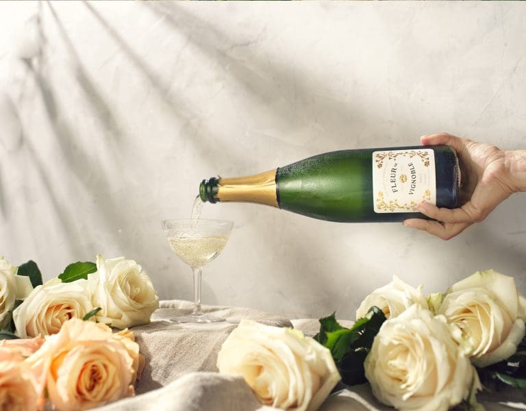 Fleur de Vignoble som på svenska betyder blomma från vingården är en vacker skapelse vars namn går igen i den estetiska etiketten prydd med blommor i guldrelief. Både insida och utsida signalerar fest och flaskan är en självklar attiralj till den fina dukningen.