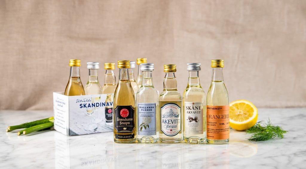 Snaps i ett behändigt format – miniflaskor. Flaskorna innehåller 5 cl snaps och är både fina att duka med och lagom nätta i sin storlek för att kunna erbjuda flera olika smaker vid ett och samma tillfälle. Utmärkt snaps att servera till klassiska skandinaviska storheter som t ex inlagd sill i alla möjliga varianter, stekt strömming på knäckemacka, lax i alla former, gravad, rökt, kokt lax med potatis och hemmagjorda pajer som görs matiga med svamp plockad i våra skandinaviska skogar. Smörrebröd är en favorit på andra sidan sundet, och därtill serveras med fördel ”en lille en” som danskarna säger om sin snaps. Och hur ser man på snaps i Norge? Mycket viktig. Akvavit betraktas som nationaldryck i vårt grannland och norrmännen är mycket stolta över sin akvavit.