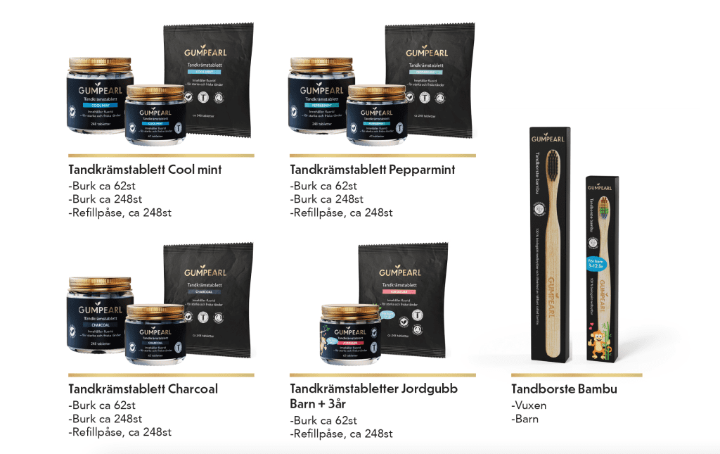 Påsarna innehåller ca 248 tandkrämstabletter och finns att köpa i Gumpearls webbshop med start 15 Februari 2023. Gumpearl tandkrämstabletter innehåller fluorid och xylitol som ger ett effektivt skydd mot karies som orsakar hål i tänderna. Tandkrämstabletterna är fria från palmolja, alkohol, SLS, plast och microplaster. Därmed står Gumpearl för ett hållbart alternativ till starka och friska tänder.
