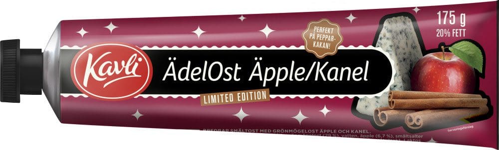 Frukt och ädelost är en traditionell kombination på ostbrickan. I år är årets smak Äpple/Kanel en fräsch och julig smakkombination i mild grönmögelostbas. Den pigga smaken kommer från fina söta äppelbitar och kanel. Fetthalt 20%.