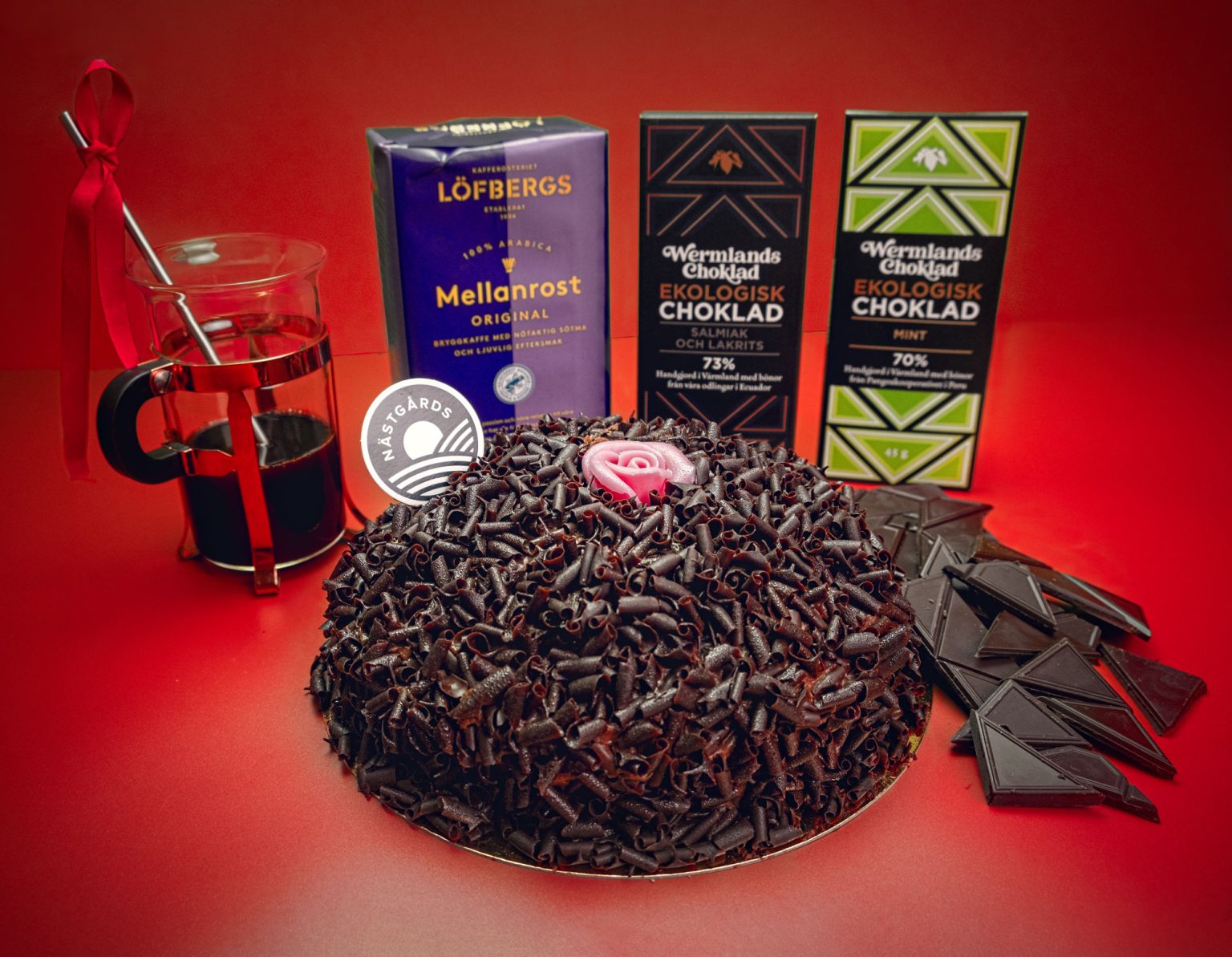 Varje jul måste avslutas med en rejäl tårta. Så tänkte vi och valde Nästgårds relativt nya tårta som är mycket vacker att se på och fylld med choklad. Tårtan är som du ser en fröjd för ögat. Smaken då? Jo då!. Krämig choklad, touch av mandel och vanilj så är detta just en Chokladdröm!