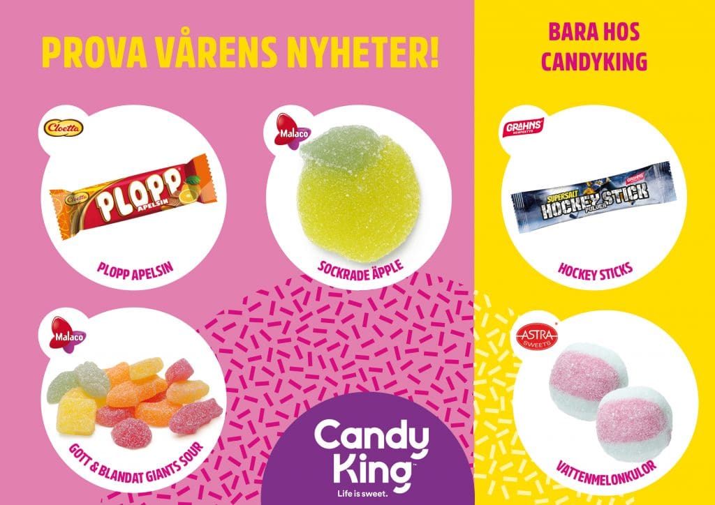 Ljusare tider innebär som vanligt att CandyKing släpper nya produkter i lösgodissortimentet på den svenska marknaden. Väntan är över för alla godisälskare! I år lanseras flera spännande nyheter tillsammans med konsumenternas mest efterfrågade favoriter i godishyllan. Nu adderas till exempel klassikern Violpistol samt superpopulära Salta- och Sura S-märken i sortimentet. Dessutom retrogodiset Hockeypulver i ett anpassat lösviktsformat och sprillans nya Vattenmelonkulor som bara finns att plocka hos CandyKing. Allihop finns i butik från och med v.8