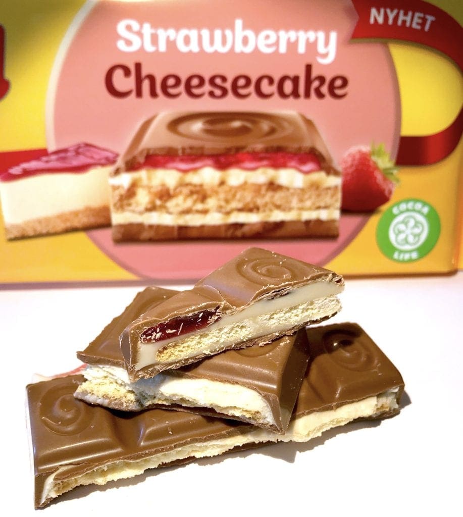 Vi är så imponerade av denna choklad. Doften är identiskt med doften från en nygjord somrig cheesecake. Smaken, ja den är inte sämre den. Här möts man av ett härligt tunt lager mjölkchoklad som möts upp med en tunt täcke jordgubbssylt. Därefter möts man av ”crunchigt” kex och känslan av cheesecake. Vi är verkligen överraskade av att produkten smakar så likt cheesecake och att den inte upplevs som för söt. Detta är verkligen en produkt som vi tror du kommer älska att plocka fram i sommar på picknicken, eller i sommarbersån med en koppkaffe och en bra bok. Wow!