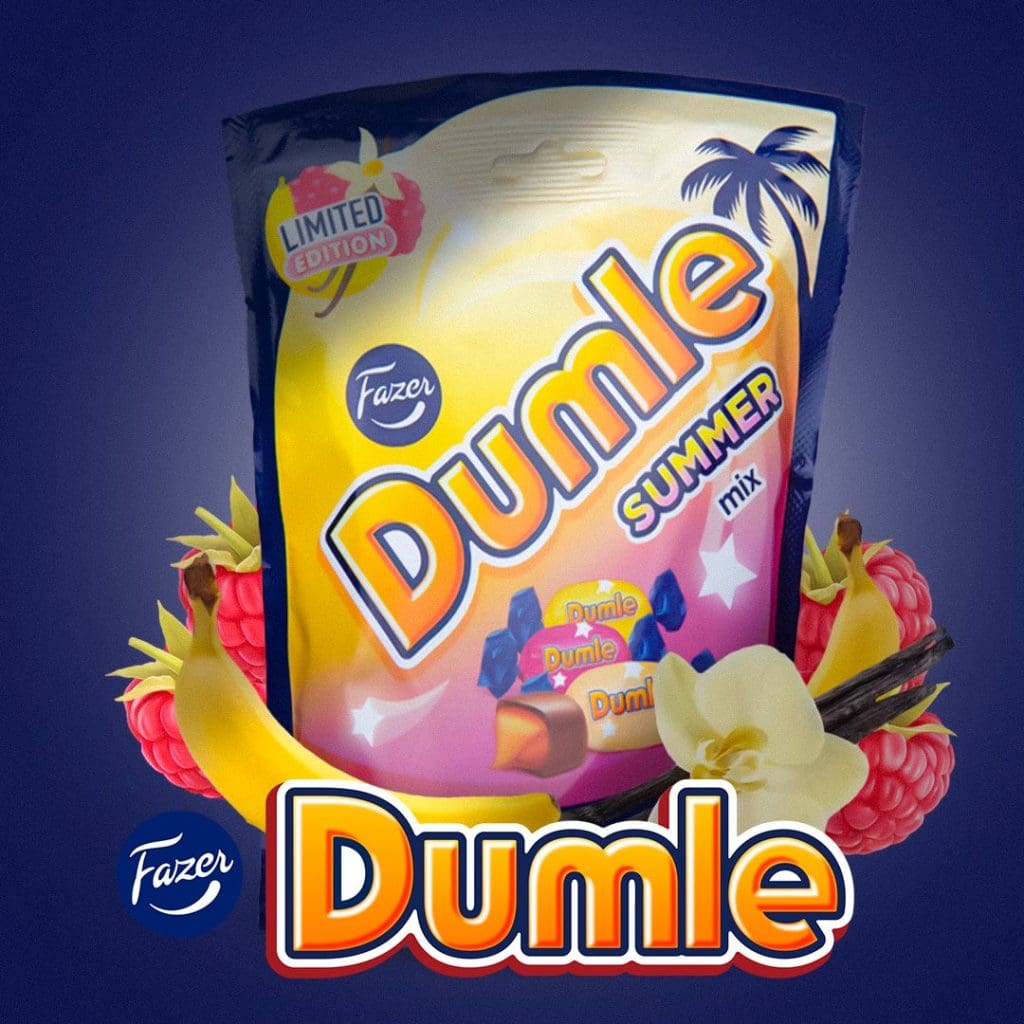 Sommarens gladaste smaköverraskning – Dumle Summer Mix. Somrig dumlekola täckt med sammetslen mjölkchoklad finns nu som en mixpåse av smakerna banan, hallon, och vanilj. Dela glädjen – påsen räcker även till vänner och familj.