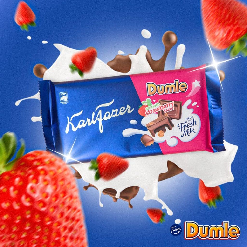 En älskad chokladklassiker som har fått sin unikt fylliga smak av noggrant utvalda råvaror alltsedan 1922. Sammetslen mjölkchoklad tillverkad av färsk mjölk har nu fått sällskap av härliga Dumle-kolabitar med smak av jordgubb. Kommer i begränsad upplaga. Perfekt att dela chokladkakan med vänner eller unna dig själv en stunds njutning. All choklad från Fazer tillverkas av ansvarsfullt producerad kakao.