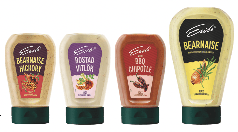 Nu lanserar Eriks® ett nytt koncept med goda och moderna såser i en smart klämflaska av 100% återvunnen plast. Först ut är nyheterna Rostad Vitlök, Bearnaise Hickory och BBQ Chipotle samt en älskad klassiker, Eriks® Bearnaise. Alla passar utmärkt till den stundande grillsäsongen men sätter även guldkant på måltiderna året runt. Produktnyheterna finns ute i butik nu.