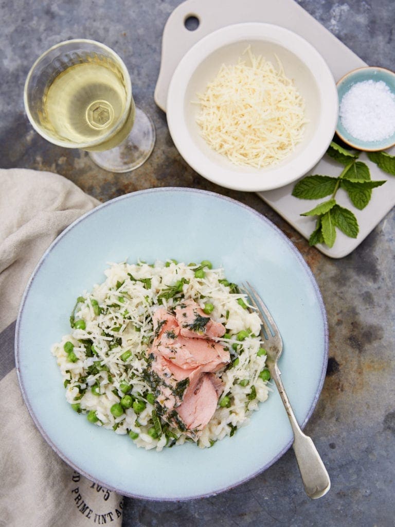 Inkokt lax, mynta- och ärtrisotto och krassemajonnäs, 4 p, 60 min
