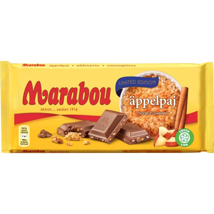 Nu presenteras det senaste tillskottet i Marabous limited edition familj – Marabou Äppelpaj. Namnet talar för sig självt, klassisk Marabou mjölkchoklad med bitar av äpple och kanelkex. Detta är en ny smak från Marabou där man omsorgsfullt smakat sig fram till den rätta kombinationen.