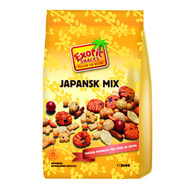Exotic Snacks Japanska Mix är idag en av den mest populära rissnacksprodukten i Sverige. Succén bakom Japansk Mix består i dess blandning av naturliga och goda råvaror samt den låga fetthalten. Detta gör Exotic Snacks Japanska Mix till ett utmärkt partysnacks! Tillverkningen av Japansk Mix är en kombination av hantverk, moderna maskiner samt strikt kvalitetskontroll under hela produktionsprocessen.