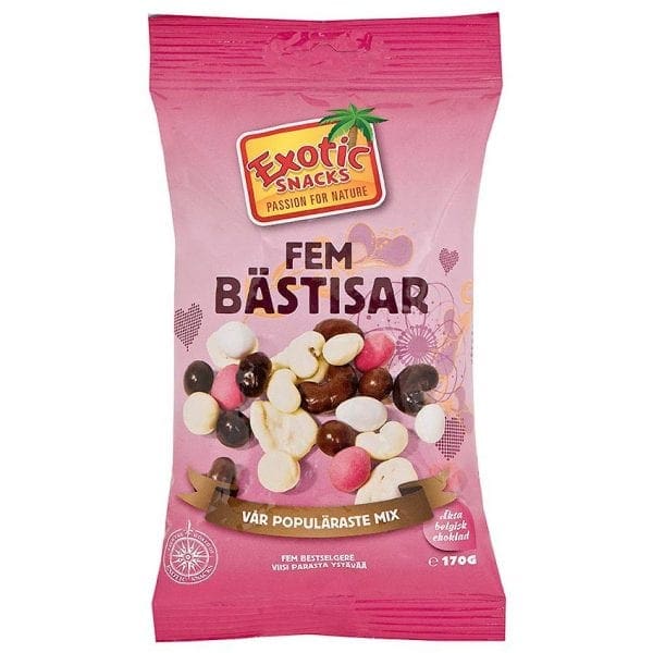 Med vårt eget varumärke Exotic Snacks är vi idag marknadsledande inom natursnacks. Under vårt varumärke har vi ett brett sortiment av högkvalitativa produkter som rymmer allt från nötter, chokladdragéer, lakrits, asiatiska rissnacks till exotiska torkade frukter. Produkterna säljs som lösvikt eller i olika storlekar av påsförpackningar.