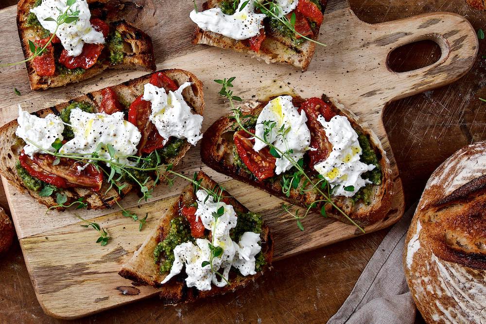 Med få, riktigt bra ingredienser kommer du långt i köket. Här har du en magisk bruschetta som du gör klart på fem minuter, perfekt till minglet, förrätten eller en lätt middag på tu man hand. Självklart tar det lite längre tid om du bakar ditt bröd själv och gör din egen pesto. Tips är i så fall att förbereda det tidigare på dagen. Vi köper bröd och pesto och toppar med rikligt av den krämiga burratan.