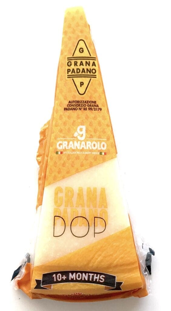 Grana Padano DOP är en typisk italiensk hårdost och vid framställningen används enbart komjölk från gårdar i Padanadalen i norra Italien. Ingredienser: mjölk, salt, löpe, konserveringsmedel lysozym av ägg.