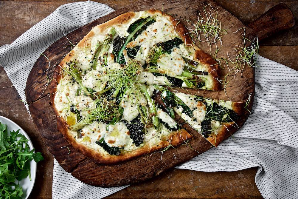 Pizza – i Italien lägger man Mozzarella på pizza, punkt. Vi bjuder på en grön pizza bianca med späd svartkål, salladslök och blomkålsblommor – toppad med Mozzarella såklart.
