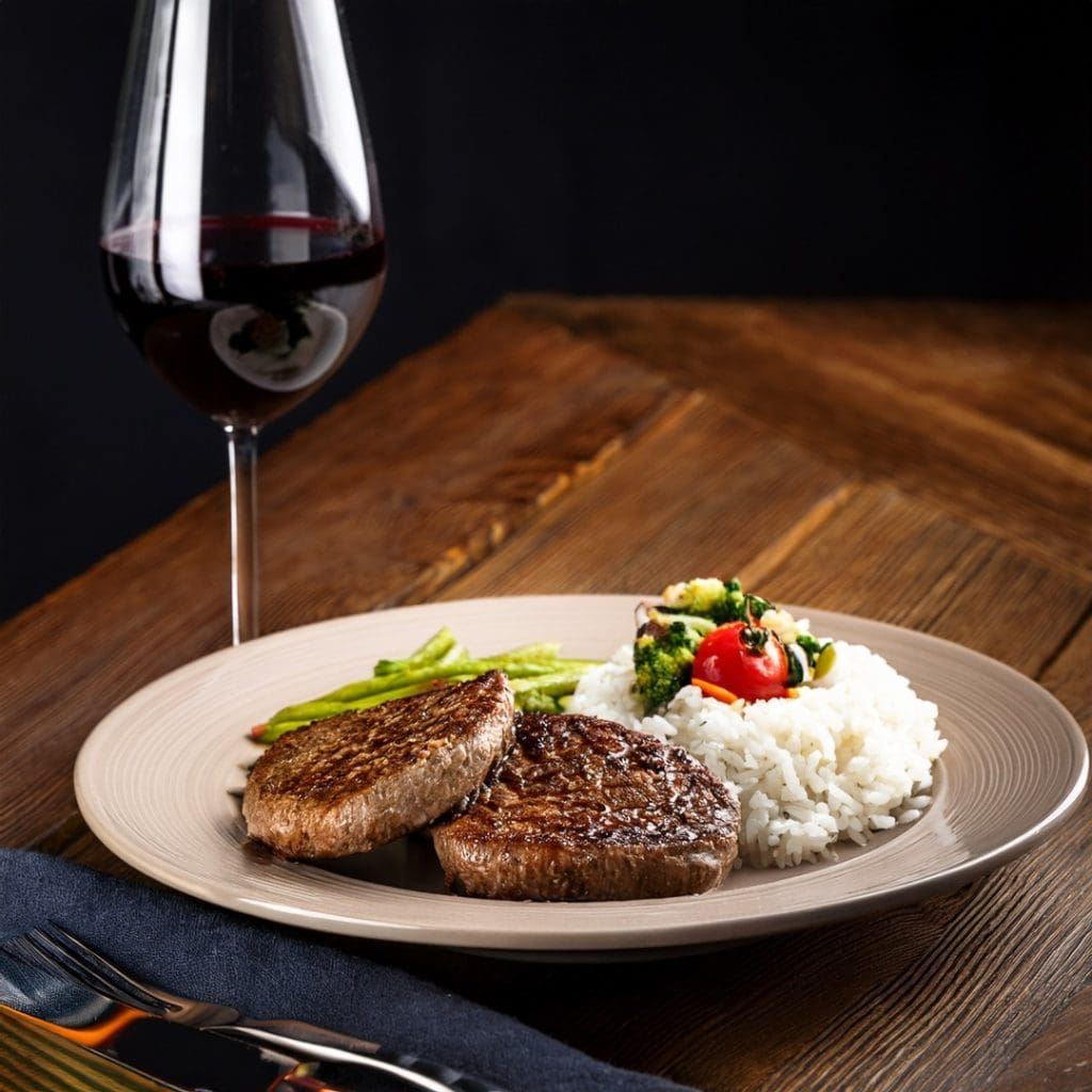 När det kommer till matkombinationer har vi valt att servera vinet tillsammans med vegetariska biffar och ris. Kombinationen visade sig vara ett utmärkt val, då de jordiga och fylliga smakerna i de vegetariska biffarna harmoniserar väl med vinets fruktighet och chokladnyanser. Riset fungerar som en neutral bas som låter vinets komplexitet skina igenom.