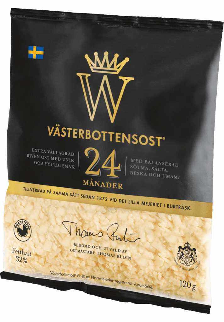 Västerbottensost® firar 150 år under 2022. Som en del av firandet breddas nu sortimentet med en förpackning riven ost med en lagringstid på hela 24 månader.