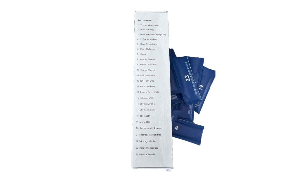 Sammanfattning: En kalender som är briljant gjord både till design och blandningen i boxen av kaffe. Gott kaffe med fina smaker. Vi tycker det är kul att man liksom blir bjuden på olika koppar och att man hittar en favorit. Hittar man ett favoritkaffe kanske man kan hitta Det kaffe i större förpackning senare från den leverantören.