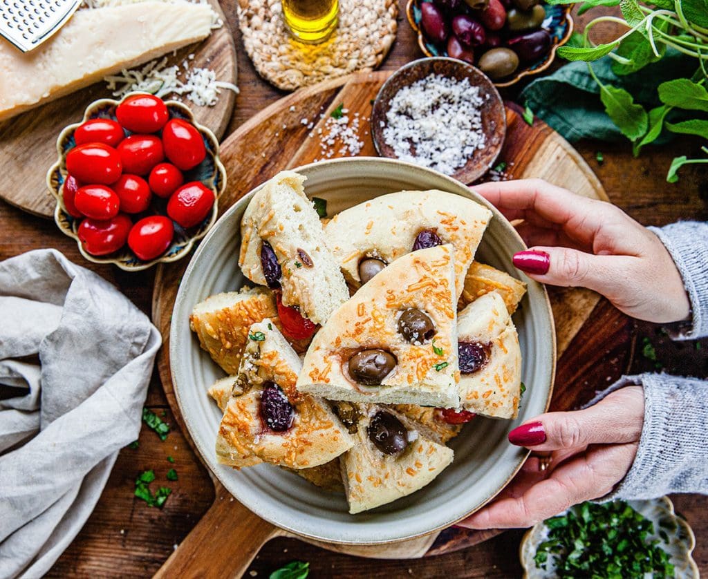 Vem kan motstå italiensk focaccia? Med ost på är njutningen total. Har du inte testat att göra flera mindre focaccia är det hög tid nu. Dekorera brödet med råvaror du gillar; som oliver, färska örter, tomat och på toppen ett rejält lager Granarolo Quattrocento Grovriven. Magnifico!