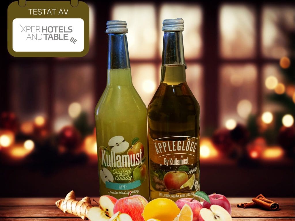 Xperhotelsandtable testar två trevliga drycker från Kullmust. Två drycker står uppdukade och buteljerna innehåller en Kullamust i ofiltrerad version!