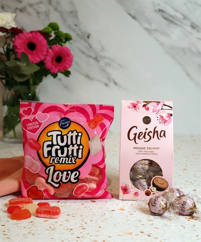 Vänskap och kärlek är värda att hyllas. I år lanserar Fazer flera smakrika nyheter lagom till Alla hjärtans dag: lyxiga Geisha Moussekulor och en specialutgåva av Tutti Frutti Remix Love – en mix av mjuka skumgodisar, saftiga vingummin och krispiga dragéer.