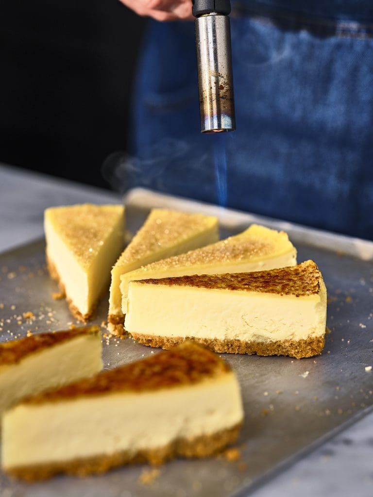 Det är dock kronan på verket som gör denna cheesecake helt unik. Innan servering strör du generöst med socker över toppen och bränner det med en brännare tills det karamelliseras till ett gyllenbrunt, knäckigt täcke. När du sedan sätter skeden i kakan bryts det spröda sockret och avslöjar den mjuka, krämiga fyllningen under. Smaken är helt makalös, nästan obeskrivligt ljuvlig. Kombinationen av sötma, det knäckiga karamelliserade sockret och den kalla, krämiga cheesecaken skapar en sensation som är svår att motstå. Vi tror att denna cheesecake, serverad med ett glas iskaffe, kommer att bli en succé som dessert efter en lättare måltid, eller som en svalkande njutning en solig dag på uteserveringen. Den kommer garanterat att lämna ett bestående intryck på dina gäster.”